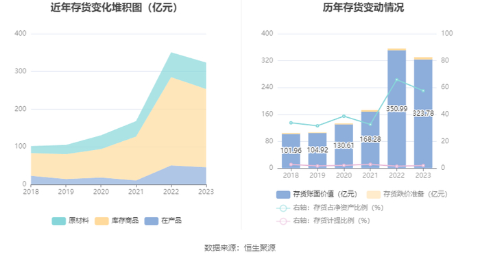 从存货变动来看,截至2023年年末,公司存货账面价值为323.78亿元,占净资产的57.67%,较上年末减少27.21亿元。其中,存货跌价准备为6.75亿元,计提比例为2.04%。