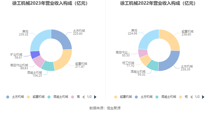 分产品来看,2023年公司主营业务中,土方机械收入225.60亿元,同比下降4.56%,占营业收入的24.30%;起重机械收入211.87亿元,同比下降11.20%,占营业收入的22.82%;混凝土机械收入104.25亿元,同比增长9.72%,占营业收入的11.23%。