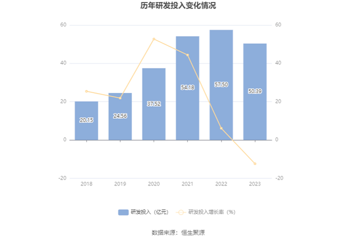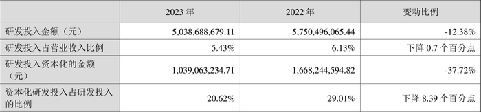 2023年全年,公司研发投入金额为50.39亿元,同比下降12.38%;研发投入占营业收入比例为5.43%,相比上年同期下降0.70个百分点。此外,公司全年研发投入资本化率为20.62%。