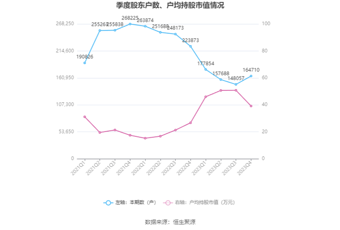 筹码集中度方面,截至2023年年末,公司股东总户数为16.47万户,较三季度末增长了1.67万户,增幅11.25%;户均持股市值由三季度末的50.84万元下降至39.17万元,降幅为22.95%。