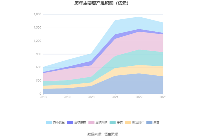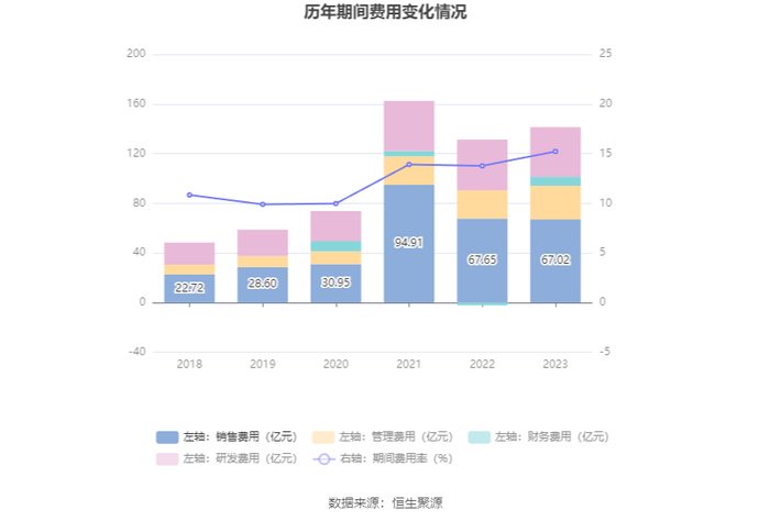 2023年,公司期间费用为141.34亿元,较上年同期增加12.12亿元;期间费用率为15.22%,较上年同期上升1.45个百分点。其中,销售费用同比下降0.93%,管理费用同比增长18.44%,研发费用同比下降2.02%,财务费用由去年同期的-2.11亿元变为7.26亿元。