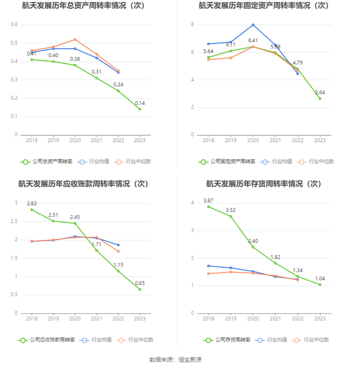 营运能力方面,2023年,公司公司总资产周转率为0.14次,上年同期为0.24次(2022年行业平均值为0.34次,公司位居同行业44/60);固定资产周转率为2.64次,上年同期为4.79次(2022年行业平均值为4.45次,公司位居同行业27/60);公司应收账款周转率、存货周转率分别为0.65次、1.04次。