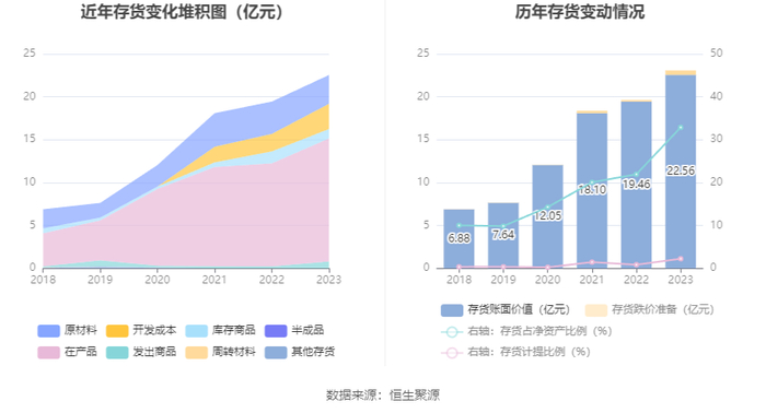 从存货变动来看,截至2023年年末,公司存货账面价值为22.56亿元,占净资产的32.88%,较上年末增加3.1亿元。其中,存货跌价准备为5160.54万元,计提比例为2.24%。