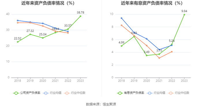 在偿债能力方面,公司2023年年末资产负债率为38.78%,相比上年末上升8.21个百分点;有息资产负债率为9.94%,相比上年末上升4.70个百分点。