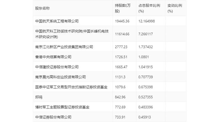 年报显示,2023年年末公司十大流通股东中,新进股东为博时军工主题股票型证券投资基金、中信证券股份有限公司,取代了三季度末的富国中证军工龙头交易型开放式指数证券投资基金、中证500交易型开放式指数证券投资基金。在具体持股比例上,香港中央结算有限公司持股有所上升,中信建投证券股份有限公司、国泰中证军工交易型开放式指数证券投资基金持股有所下降。