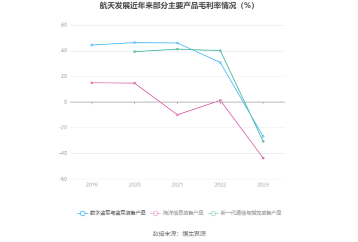 分产品看,数字蓝军与蓝军装备产品、海洋信息装备产品、新一代通信与指控装备产品2023年毛利率分别为-26.77%、-43.61%、-30.61%。