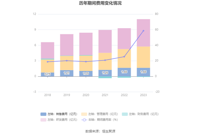 2023年,公司期间费用为10.94亿元,较上年同期增加1.90亿元;期间费用率为58.75%,较上年同期上升33.38个百分点。其中,销售费用同比增长0.31%,管理费用同比增长13.8%,研发费用同比增长31.1%,财务费用由去年同期的-2498.86万元变为-1059.73万元。
