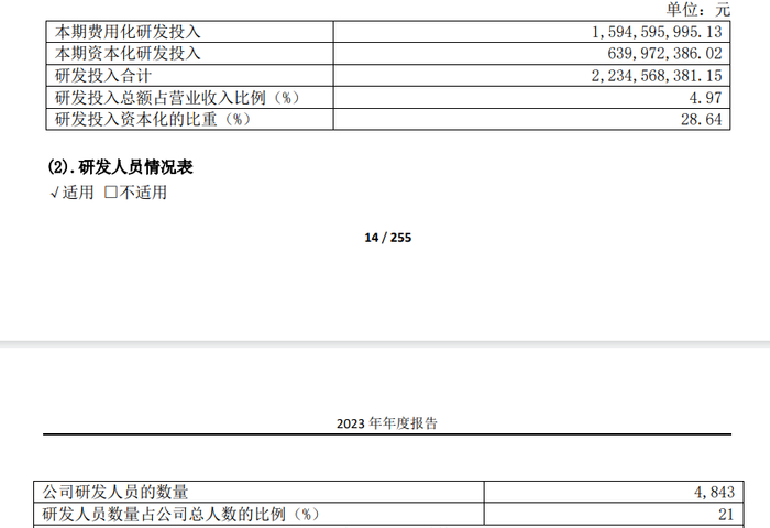 2023年,江淮汽车研发投入共计22.35亿元,同比增长21.92%,研发投入总额占营业收入的比例为4.97%;公司研发人员的数量4843人,占公司总人数的21%。