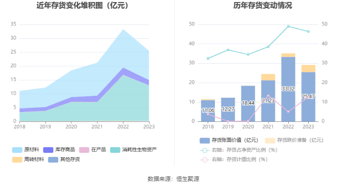 从存货变动来看,截至2023年年末,公司存货账面价值为25.47亿元,占净资产的46.36%,较上年末减少7.84亿元。其中,存货跌价准备为3.67亿元,计提比例为12.59%。