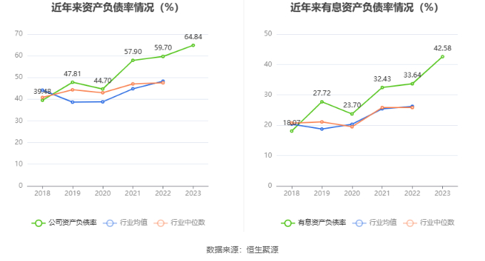 在偿债能力方面,公司2023年年末资产负债率为64.84%,相比上年末上升5.14个百分点;有息资产负债率为42.58%,相比上年末上升8.94个百分点。