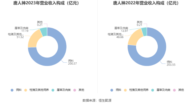 分产品来看,2023年公司主营业务中,饲料收入200.57亿元,同比下降1.46%,占营业收入的74.43%;屠宰及肉类收入17.19亿元,同比增长32.58%,占营业收入的6.38%;动物保健收入0.20亿元,同比下降2.86%,占营业收入的0.07%。