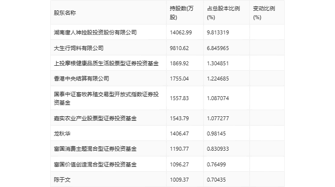 年报显示,2023年年末公司十大流通股东中,新进股东为嘉实农业产业股票型证券投资基金、富国消费主题混合型证券投资基金、富国价值创造混合型证券投资基金,取代了三季度末的湖南财信精信投资合伙企业(有限合伙)、新华人寿保险股份有限公司-分红-团体分红-018L-FH001深、刘志兵。在具体持股比例上,香港中央结算有限公司、陈于文持股有所上升,上投摩根健康品质生活股票型证券投资基金、国泰中证畜牧养殖交易型开放式指数证券投资基金、龙秋华持股有所下降。