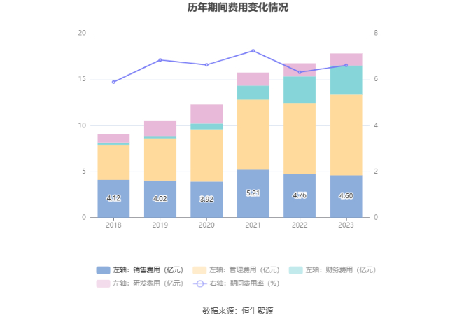 2023年,公司期间费用为17.84亿元,同比增长1.08亿元;期间费用率为6.62%,同比增长0.3个百分点。其中,销售费用同比下降3.35%,管理费用同比增长13.72%,研发费用同比下降6.33%,财务费用同比增长9.37%。