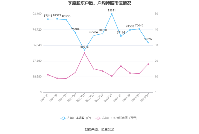 筹码集中度方面,截至2023年年末,公司股东总户数为5.93万户,较三季度末下降了1.63万户,降幅21.61%;户均持股市值由三季度末的12.07万元上升至18.13万元,增幅为50.21%。