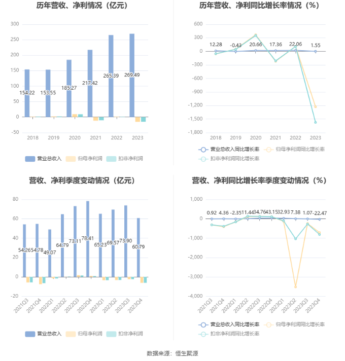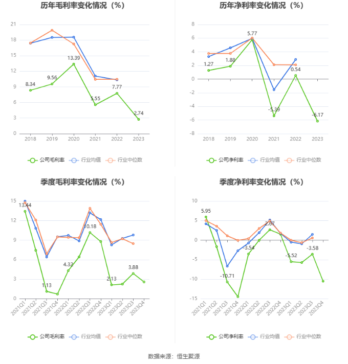 2023年,公司毛利率为2.74%,同比下降5.03个百分点;净利率为-6.17%,较上年同期下降6.71个百分点。从单季度指标来看,2023年第四季度公司毛利率为2.58%,同比下降6.21个百分点,环比下降1.30个百分点;净利率为-10.50%,较上年同期下降12.05个百分点,较上一季度下降6.92个百分点。