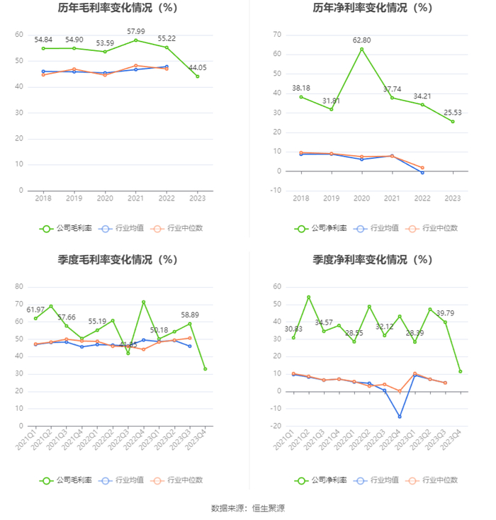 2023年,公司毛利率为44.05%,同比下降11.17个百分点;净利率为25.53%,较上年同期下降8.68个百分点。从单季度指标来看,2023年第四季度公司毛利率为32.88%,同比下降38.59个百分点,环比下降26.01个百分点;净利率为11.46%,较上年同期下降31.72个百分点,较上一季度下降28.33个百分点。