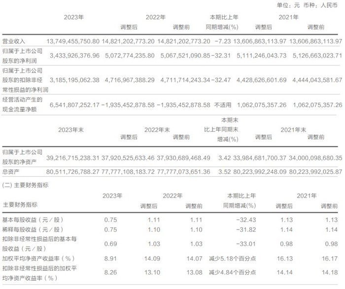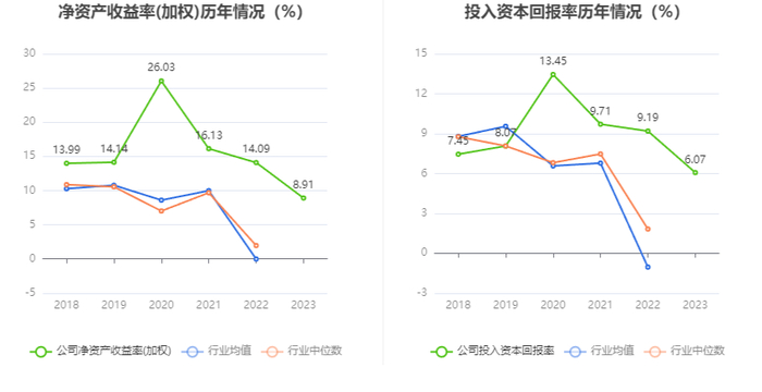数据显示,2023年公司加权平均净资产收益率为8.91%,较上年同期下降5.18个百分点;公司2023年投入资本回报率为6.07%,较上年同期下降3.12个百分点。