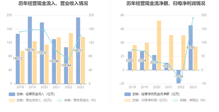 2023年,公司经营活动现金流净额为65.42亿元,同比增加84.77亿元;筹资活动现金流净额-38.17亿元,同比减少3.70亿元;投资活动现金流净额-14.22亿元,上年同期为60.41亿元。