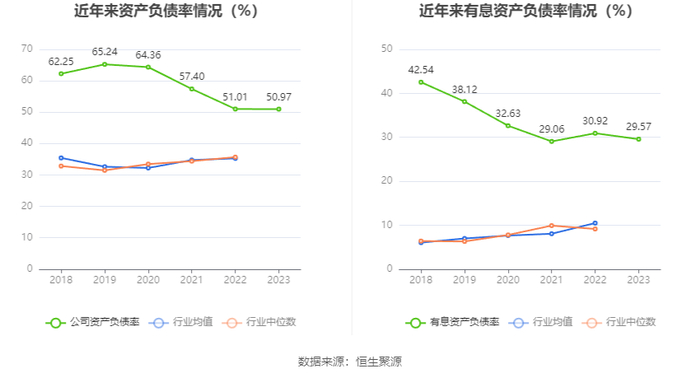 在偿债能力方面,公司2023年年末资产负债率为50.97%,相比上年末下降0.04个百分点;有息资产负债率为29.57%,相比上年末下降1.35个百分点。