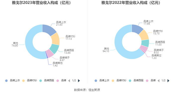 分产品来看,2023年公司主营业务中,品牌上衣收入21.63亿元,同比增长20.32%,占营业收入的15.73%;品牌衬衫收入17.13亿元,同比增长8.76%,占营业收入的12.46%;品牌西服收入13.44亿元,同比增长21.83%,占营业收入的9.77%。