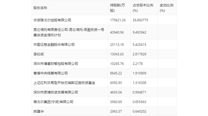 年报显示,2023年年末公司十大流通股东中,持股最多的为宁波雅戈尔控股有限公司,占比36.86%。十大流通股东名单相比2023年三季报维持不变。在具体持股比例上,宁波雅戈尔控股有限公司、上证红利交易型开放式指数证券投资基金持股有所上升,香港中央结算有限公司持股有所下降。