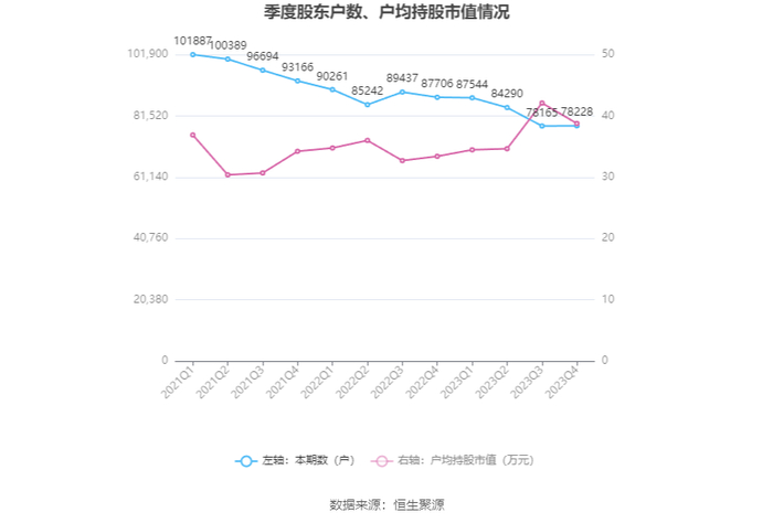 筹码集中度方面,截至2023年年末,公司股东总户数为7.82万户,较三季度末增长了63户,增幅0.08%;户均持股市值由三季度末的42.10万元下降至38.76万元,降幅为7.93%。