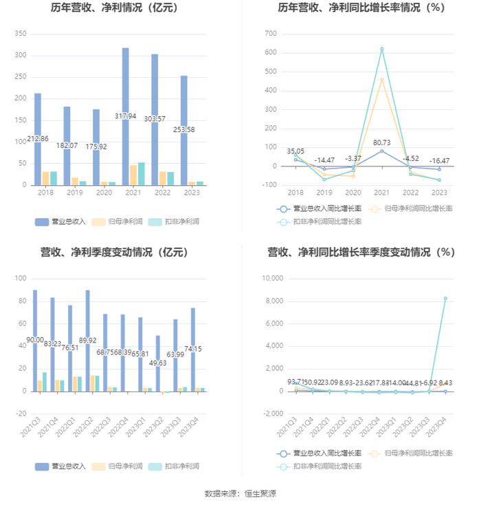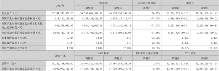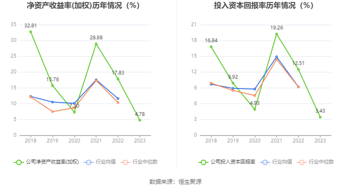 数据显示,2023年公司加权平均净资产收益率为4.78%,较上年同期下降13.05个百分点;公司2023年投入资本回报率为3.43%,较上年同期下降9.08个百分点。