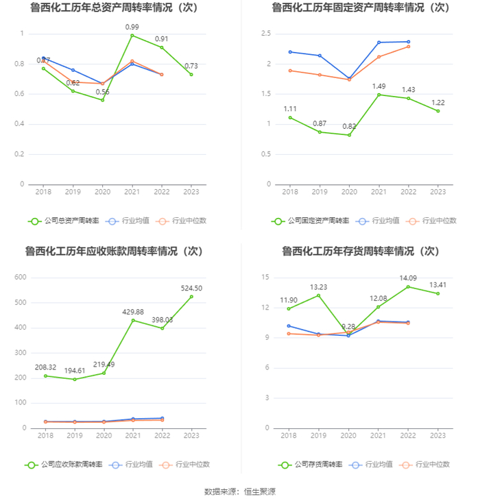 营运能力方面,2023年,公司公司总资产周转率为0.73次,上年同期为0.91次(2022年行业平均值为0.73次,公司位居同行业17/58);固定资产周转率为1.22次,上年同期为1.43次(2022年行业平均值为2.37次,公司位居同行业46/58);公司应收账款周转率、存货周转率分别为524.50次、13.41次。