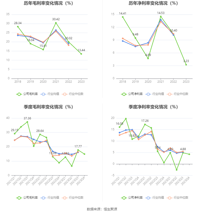 2023年,公司毛利率为13.44%,同比下降6.58个百分点;净利率为3.23%,较上年同期下降7.17个百分点。从单季度指标来看,2023年第四季度公司毛利率为14.91%,同比上升6.10个百分点,环比下降2.86个百分点;净利率为4.23%,较上年同期上升3.67个百分点,较上一季度下降0.65个百分点。