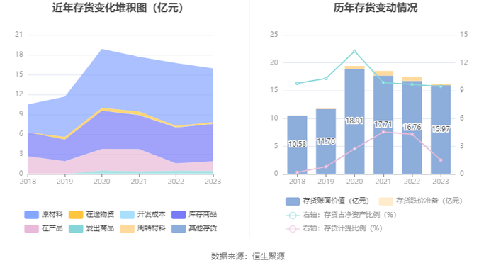 从存货变动来看,截至2023年年末,公司存货账面价值为15.97亿元,占净资产的9.45%,较上年末减少7959.67万元。其中,存货跌价准备为2463.74万元,计提比例为1.52%。