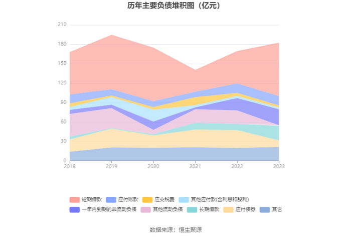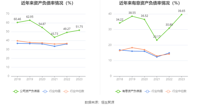 在偿债能力方面,公司2023年年末资产负债率为51.75%,相比上年末上升2.48个百分点;有息资产负债率为39.65%,相比上年末上升8.76个百分点。
