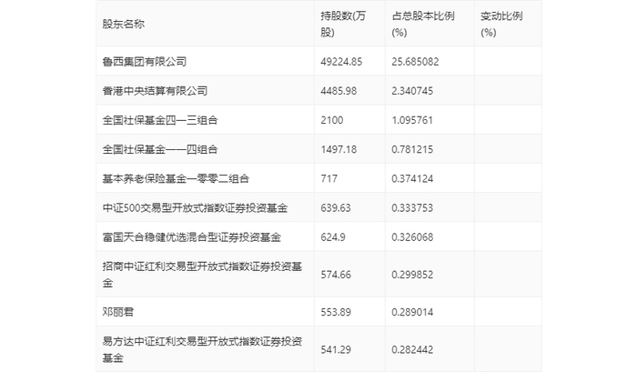 年报显示,2023年年末公司十大流通股东中,新进股东为招商中证红利交易型开放式指数证券投资基金、邓丽君、易方达中证红利交易型开放式指数证券投资基金,取代了三季度末的广发稳鑫保本混合型证券投资基金、富国美丽中国混合型证券投资基金、中国工商银行股份有限公司-银华鑫盛灵活配置混合型证券投资基金(LOF)。在具体持股比例上,鲁西集团有限公司、香港中央结算有限公司、全国社保基金四一三组合、全国社保基金一一四组合、基本养老保险基金一零零二组合持股有所上升,中证500交易型开放式指数证券投资基金、富国天合稳健优选混合型证券投资基金持股有所下降。