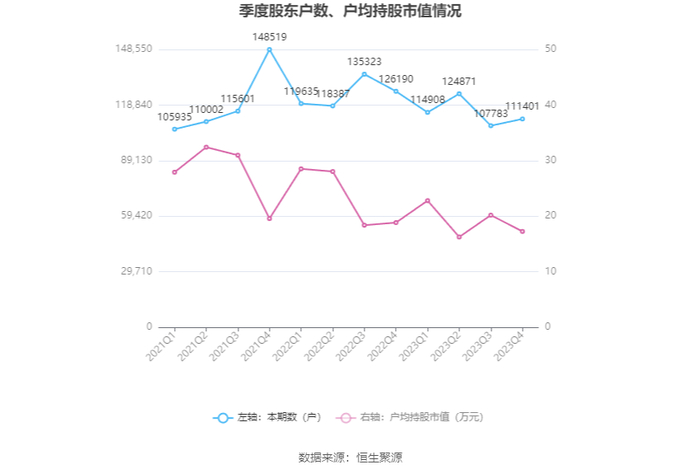 筹码集中度方面,截至2023年年末,公司股东总户数为11.14万户,较三季度末增长了3618户,增幅3.36%;户均持股市值由三季度末的20.19万元下降至17.26万元,降幅为14.51%。