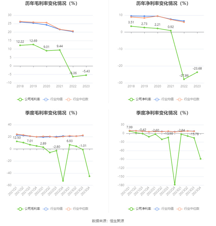 2023年,公司毛利率为-5.43%,同比上升0.93个百分点;净利率为-23.68%,较上年同期上升4.18个百分点。从单季度指标来看,2023年第四季度公司毛利率为-45.17%,同比上升7.63个百分点,环比下降44.16个百分点;净利率为-88.45%,较上年同期上升89.55个百分点,较上一季度下降72.67个百分点。