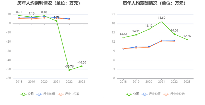截至2023年末,公司员工总数为2698人,人均创收196.98万元,人均创利-46.50万元,人均薪酬12.76万元,较上年同期分别变化7.89%、8.39%、-12.39%。
