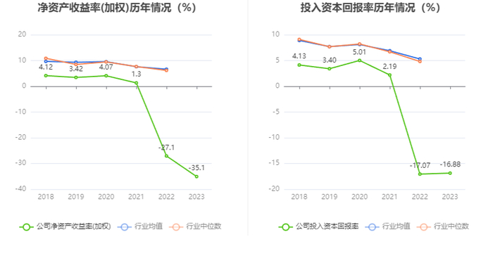数据显示,2023年公司加权平均净资产收益率为-35.10%,较上年同期下降8个百分点;公司2023年投入资本回报率为-16.88%,较上年同期增长0.19个百分点。