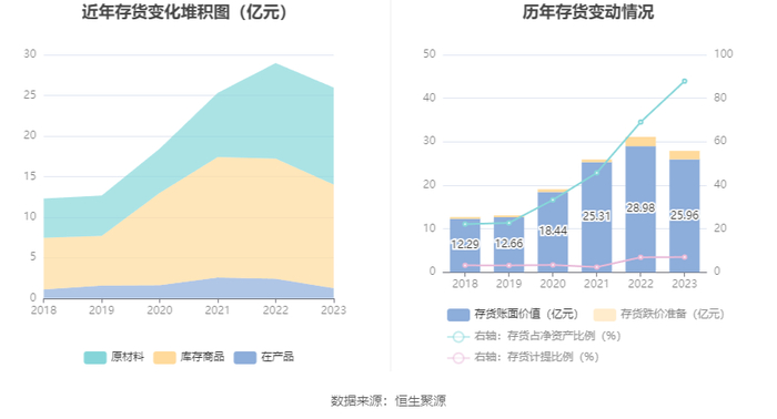 从存货变动来看,截至2023年年末,公司存货账面价值为25.96亿元,占净资产的87.89%,较上年末减少3.02亿元。其中,存货跌价准备为1.95亿元,计提比例为6.97%。