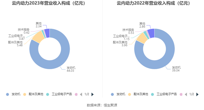 分产品来看,2023年公司主营业务中,发动机收入44.03亿元,同比增长12.79%,占营业收入的82.86%;配件及其他收入5.48亿元,同比增长38.36%,占营业收入的10.31%;工业级电子产品收入0.87亿元,同比下降23.89%,占营业收入的1.64%;技术服务收入0.42亿元,同比下降20.15%,占营业收入的0.79%。