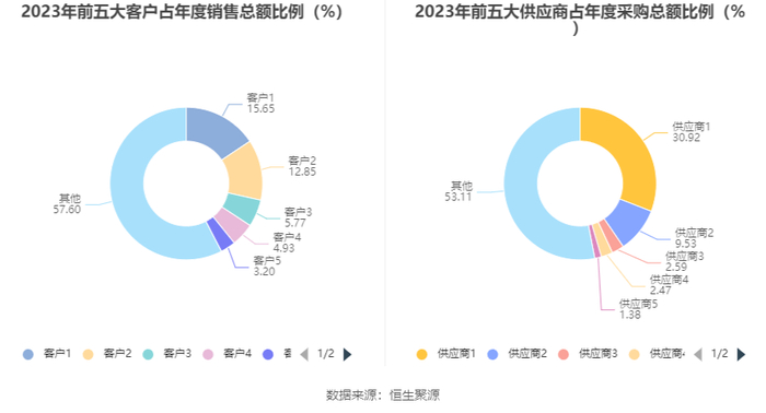 报告期内,公司前五大客户合计销售金额22.53亿元,占总销售金额比例为42.40%,公司前五名供应商合计采购金额22.96亿元,占年度采购总额比例为46.89%。