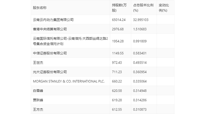 年报显示,2023年年末公司十大流通股东中,新进股东为香港中央结算有限公司、光大证券股份有限公司、MORGAN STANLEY & CO. INTERNATIONAL PLC.、白雪峰、王方杰,取代了三季度末的张杰明、卢云果、深圳市华科泰瑞电子合伙企业(有限合伙)、尹少屹、黄静。在具体持股比例上,云南云内动力集团有限公司、云南国际信托有限公司-云南信托·大西部丝绸之路2号集合资金信托计划、中信证券股份有限公司、王世杰持股有所上升,贾跃峰持股有所下降。