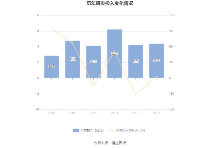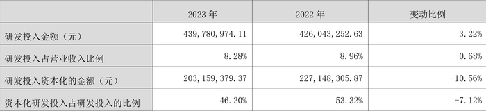 2023年全年,公司研发投入金额为4.40亿元,同比增长3.22%;研发投入占营业收入比例为8.28%,相比上年同期下降0.68个百分点。此外,公司全年研发投入资本化率为46.20%。
