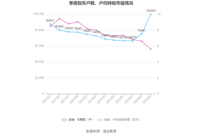 筹码集中度方面,截至2023年年末,公司股东总户数为10.23万户,较三季度末增长了2.53万户,增幅32.91%;户均持股市值由三季度末的6.61万元下降至5.63万元,降幅为14.83%。