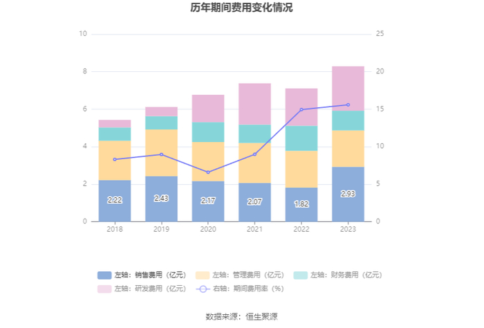 2023年,公司期间费用为8.29亿元,较上年同期增加1.18亿元;期间费用率为15.59%,较上年同期上升0.64个百分点。其中,销售费用同比增长61.31%,管理费用同比下降1.0%,研发费用同比增长18.97%,财务费用同比下降21.66%。