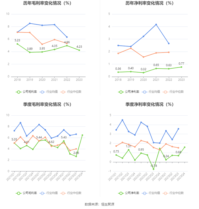 2023年,公司毛利率为4.23%,同比下降0.73个百分点;净利率为0.77%,较上年同期上升0.14个百分点。从单季度指标来看,2023年第四季度公司毛利率为6.47%,同比上升2.22个百分点,环比上升3.81个百分点;净利率为1.59%,较上年同期上升0.14个百分点,较上一季度上升0.91个百分点。