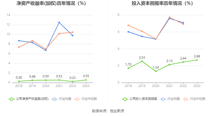 数据显示,2023年公司加权平均净资产收益率为0.55%,较上年同期增长0.32个百分点;公司2023年投入资本回报率为2.68%,较上年同期增长0.24个百分点。
