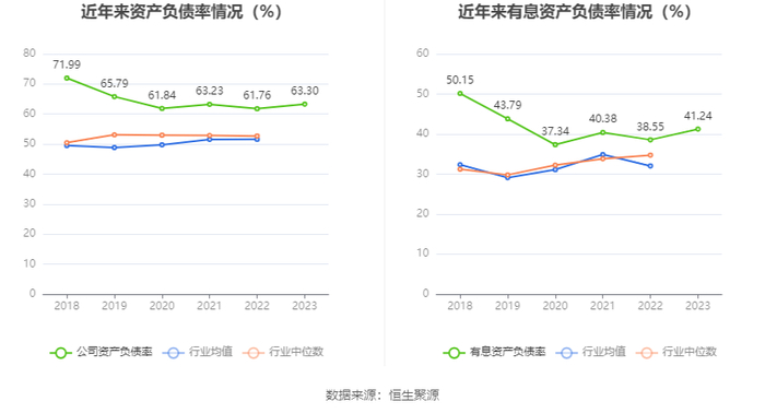 在偿债能力方面,公司2023年年末资产负债率为63.30%,相比上年末上升1.54个百分点;有息资产负债率为41.24%,相比上年末上升2.69个百分点。