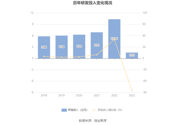 2023年全年,公司研发投入金额为1.55亿元,同比下降84.99%;研发投入占营业收入比例为0.18%,相比上年同期下降1.02个百分点。此外,公司全年研发投入资本化率为17.20%。
