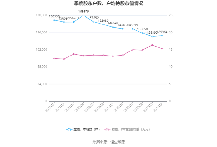 筹码集中度方面,截至2023年年末,公司股东总户数为13万户,较三季度末增长了1572户,增幅1.22%;户均持股市值由三季度末的16.38万元下降至15.33万元,降幅为6.41%。