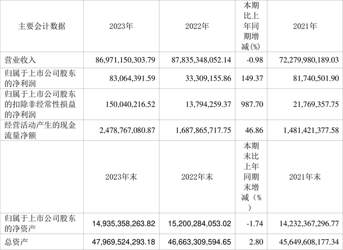 2023年,公司经营活动现金流净额为24.79亿元,同比增长46.86%;筹资活动现金流净额-4.25亿元,同比增加25.72亿元;投资活动现金流净额-13.04亿元,上年同期为5.17亿元。