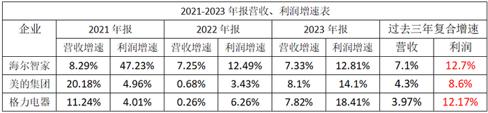 从图表中的数据可以看到,三家企业2023年净利润增速都超过2位数。其中,海尔智家2021年的利润增速是47.23%,2022年是12.49%,2023年是12.81%。从这三个数据看到,海尔智家的增长最为稳健。